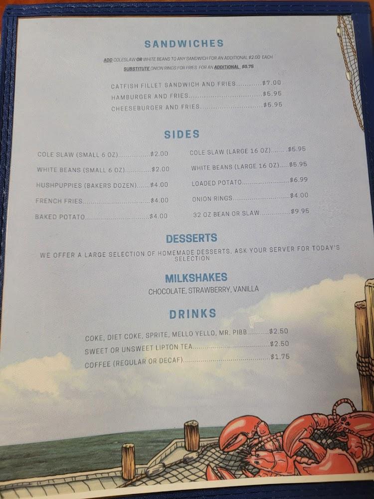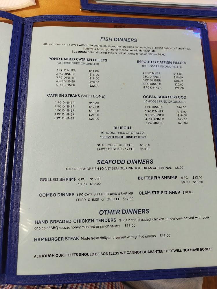 The menu at The Catfish House features a variety of Southern classics and seafood. Fried catfish is the star, available in several options, including fillets and steaks. Comfort foods like chicken tenders and a selection of sides, such as coleslaw and fries, complete the offerings.